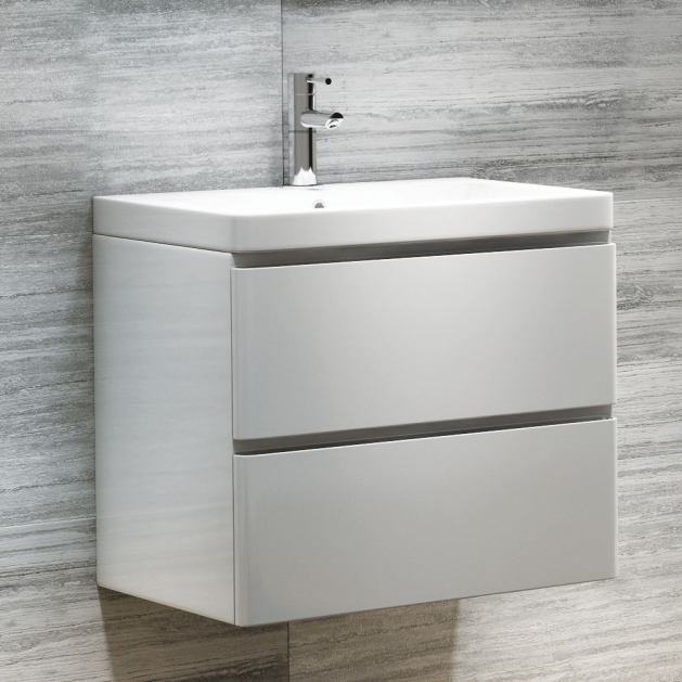This gloss white handle-less vanity unit features a wall hung vanity unit with two drawer and one tap hole.