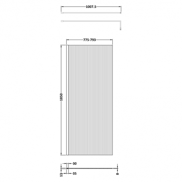 800mm Fluted Wetroom Screen with Support Bar - V-WETFRL18580 Chrome