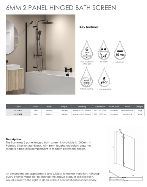 The frameless 2 panel hinged bath screen is available is 1000mm in Polished Silver or Matt Black. With 6mm toughened safety glass the range is a beautiful complement to any modern bathroom design.