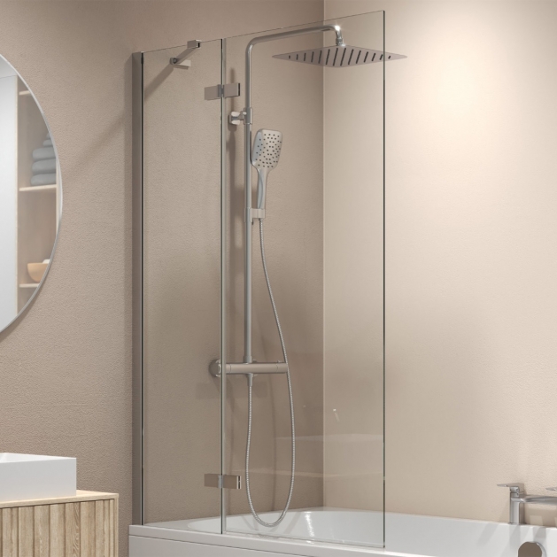 The frameless 2 panel hinged bath screen is available is 1000mm in Polished Silver or Matt Black. With 6mm toughened safety glass the range is a beautiful complement to any modern bathroom design.