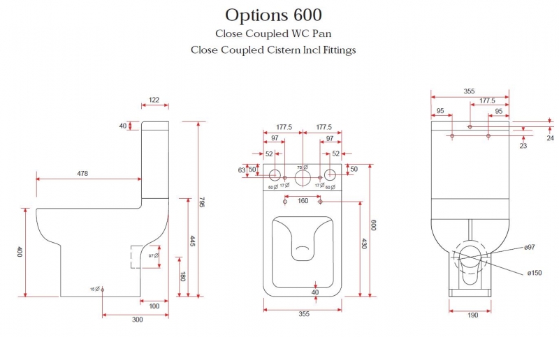 Options 600 Close Coupled Toilet And Seat is a compact dual flush close coupled toilet which has the pan, cistern and seat included. The seat included is a wrap over Soft Close Seat. The toilet is beautifully designed with clean crisp lines and has a projection of only 600mm, making it one of the shortest projection toilets on the market from front to back, combining that modern style but with a streamlined design.