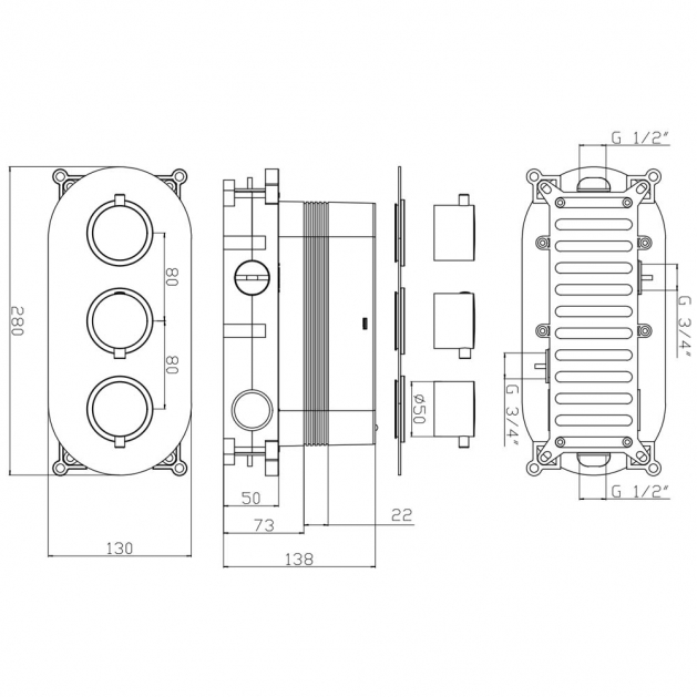 Brushed Brass Triple Concealed Shower Valve - By Voda Design