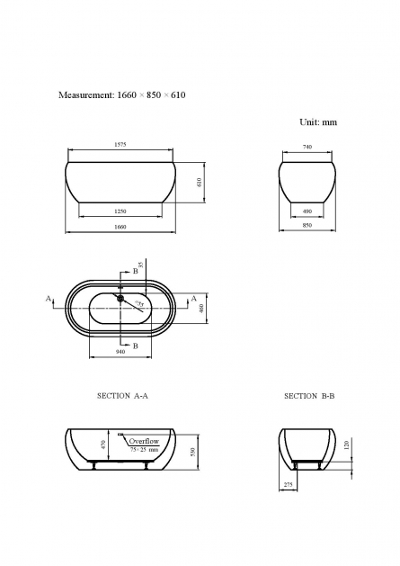 Specifications: Length: 1660mm, Width: 850mm, Height: 610mm