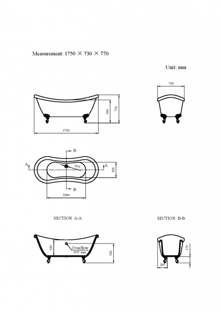 Specifications: Length: 1750mm, Width: 730mm, Height: 770mm,