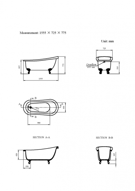 Freestanding Traditional Single Ended Slipper Bath With Ball & Claw Feet 1555mm - Brentwood By Synergy 1555 x 725mm White