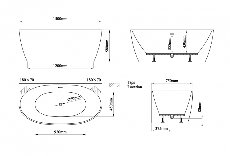 - Sizes: from 1455mm (compact) through to 1900mm Large 2 Person Baths