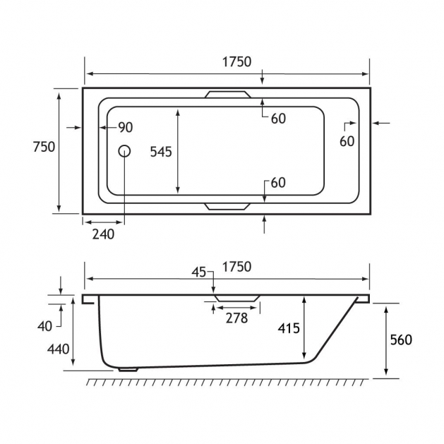 Kansas Single Ended Bath Drilled For Twin Grips 1750x750- KAN13 White