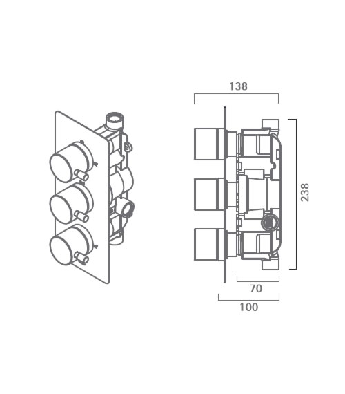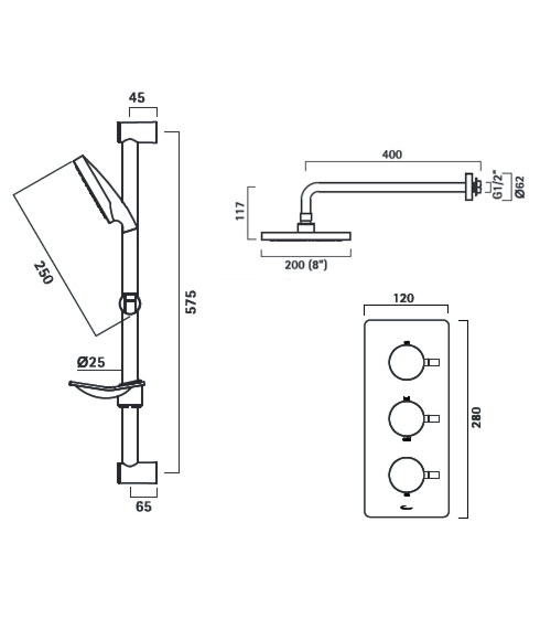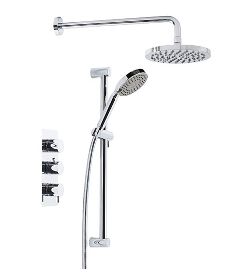 For this shower you have a 3 way thermostatic valve which is easy to use and stylish in its appearance. Simply set the temperature with the middle dial and then use the bottom control to turn the shower handset on and the top control to activate the fixed head. The same handles also adjust the flow rate. For the ultimate shower experience, provided you have sufficient water pressure, you can have both shower outlets on at the same time.