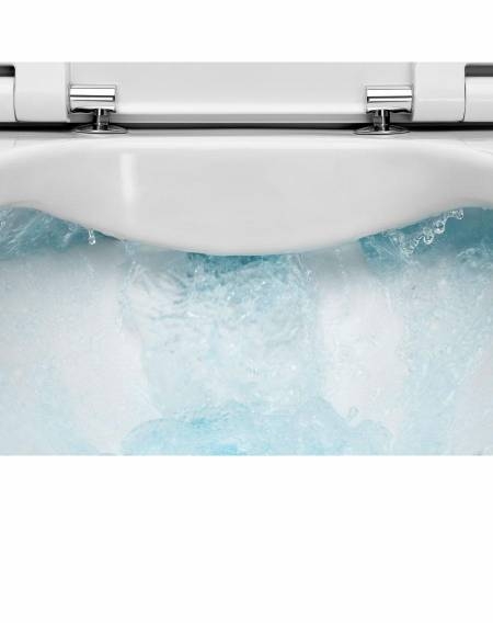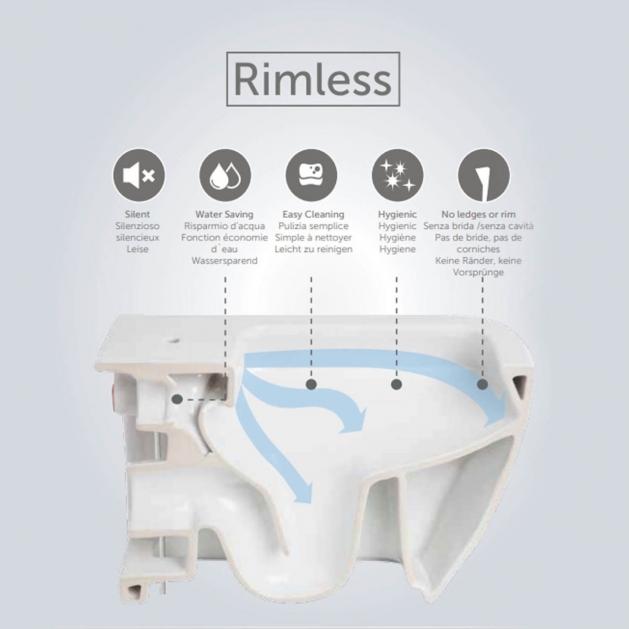 The modern close coupled toilet features the latest rimless technology. Traditionally, water is released from the rim around the top of the toilet pan which can lead to a build-up of germs as the rim can be hard to clean. The new rimless pan has a smooth interior and water is projected from the back of the toilet all the way around the pan and down into the bowl, washing away any germs.