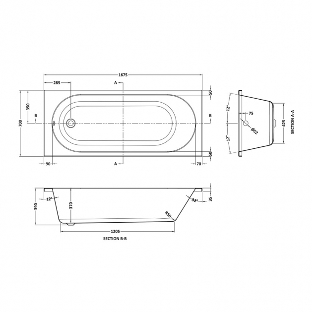 Round Straight Bath 1675 x 700mm - VBATH039 White