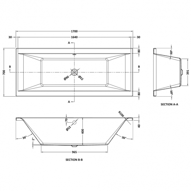 Square Double Ended Bath 1700 x 700mm - VBATH011 White