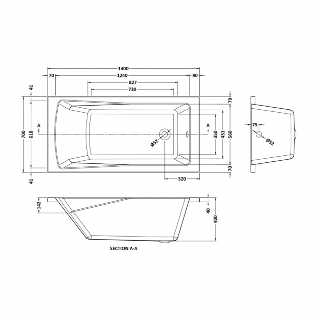 Square Single Ended Bath 1400 x 700mm - VBATH040 White