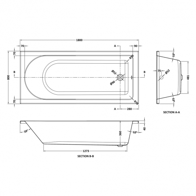 Standard Single Ended Bath 1800 x 800mm - VBATH023 White