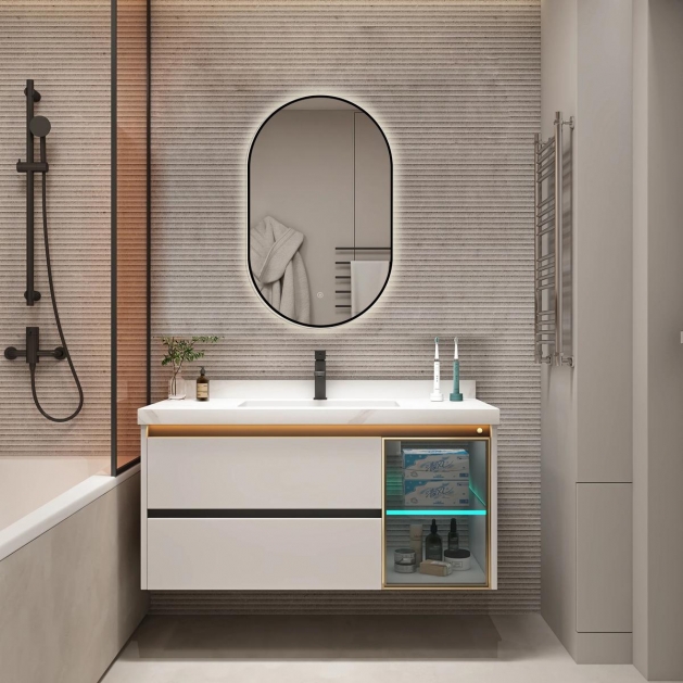 Tablet combines the practicality and functionality of a mirror into a stylish oval design. Available in matte black and brushed brass, Tablet features multi-functional contactless light controls from cool to warm brightness