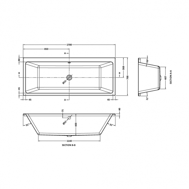 Thin Edge Double Ended Bath 1700 x 700mm - VBATH018 White