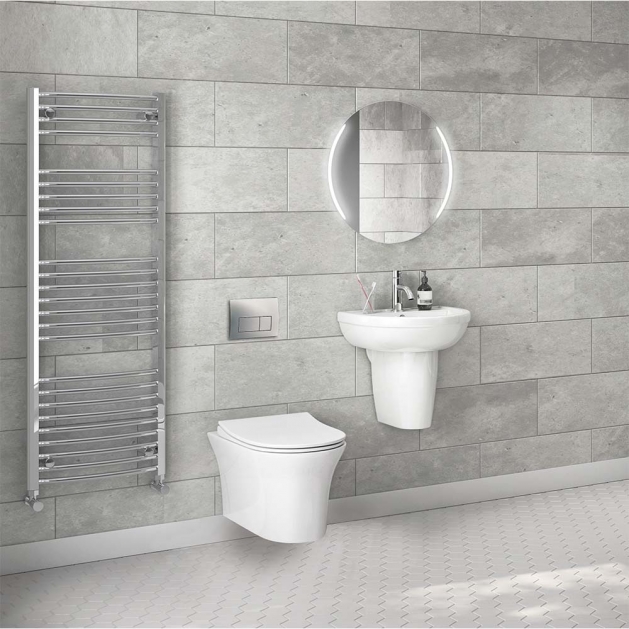 Key features include a highly contemporary rounded design, slimline - soft closing toilet seat and rimless wall hung pan which maximises the cleaning area and distributes water much more evenly and consistently.