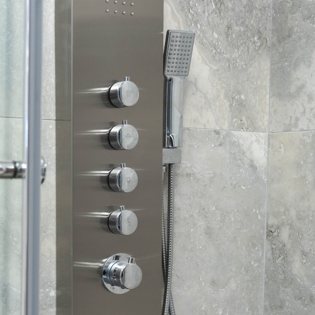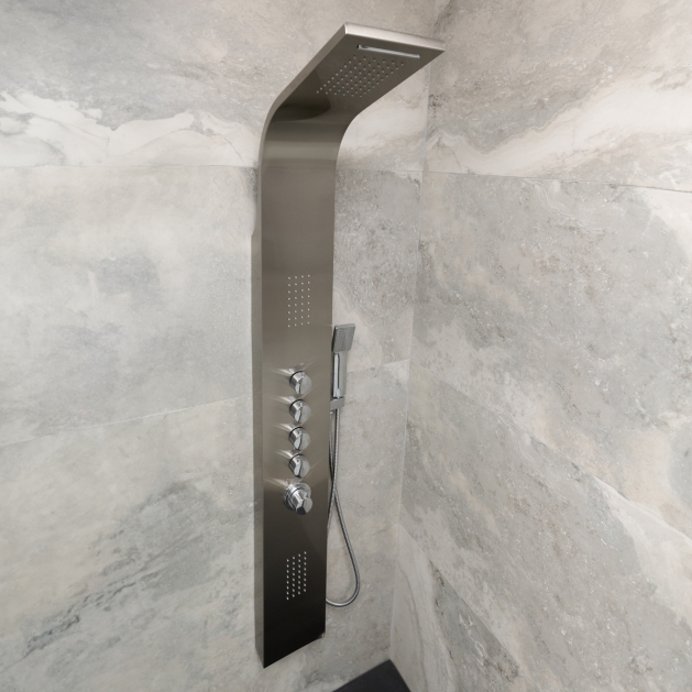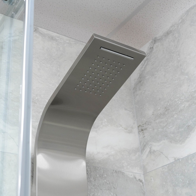 Our Waterfall Shower Tower is the pinnacle of modern luxury, available in both polished chrome and sleek black finishes. Its seamless design and minimalist aesthetic make it a standout choice for contemporary bathrooms. This ultra-modern shower unit offers exceptional features, including a fixed rainfall head with a striking waterfall flow, two body jets for a refreshing massage experience, and a handheld shower head for flexibility. Built with fast-acting thermostatic control, the Monsoon maintains your preferred water temperature, providing both comfort and safety. It combines style and functionality for an elevated shower experience without compromise.